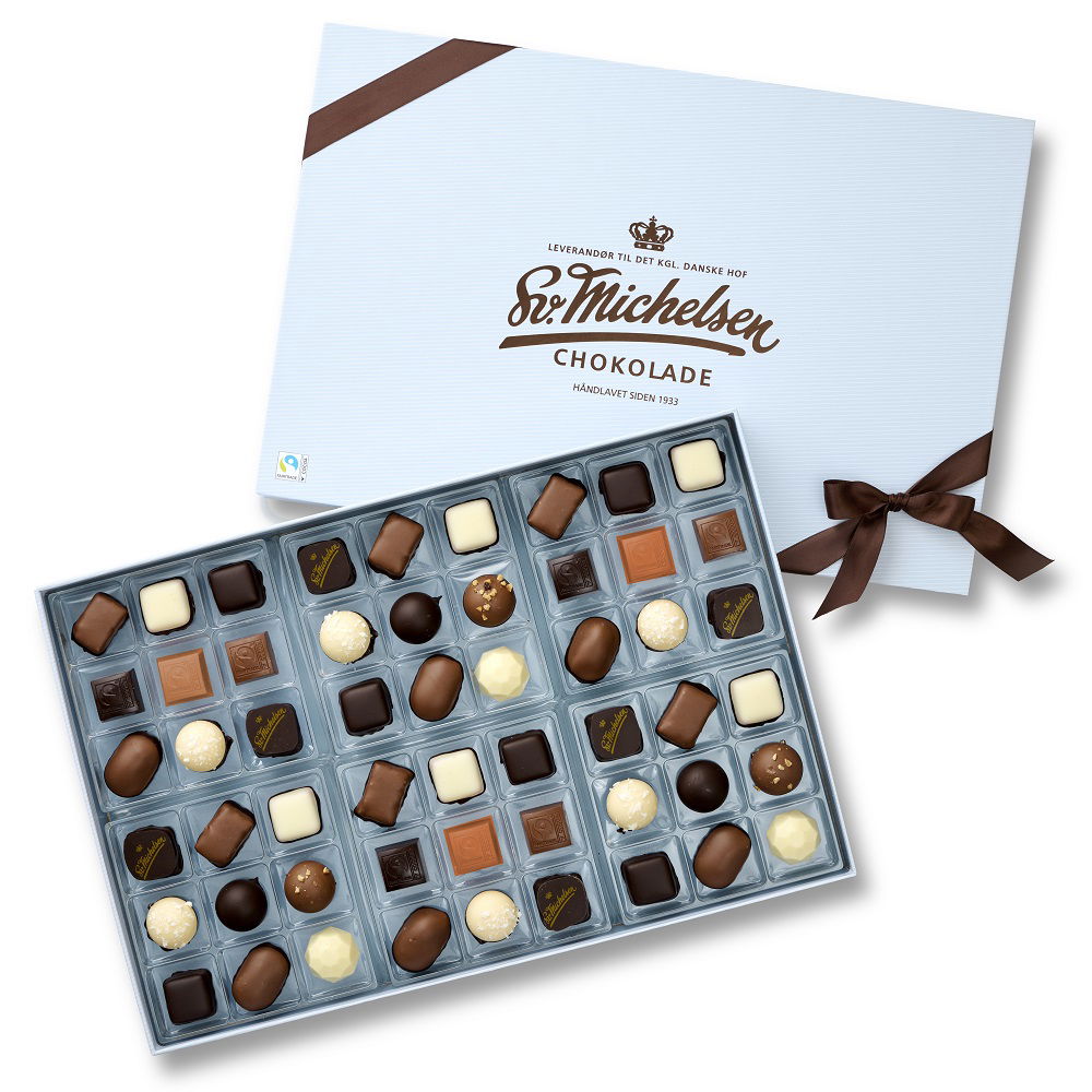 Den ultimative gaveæske: Vores Krone med 54 stykker håndlavet Fairtrade chokolade.